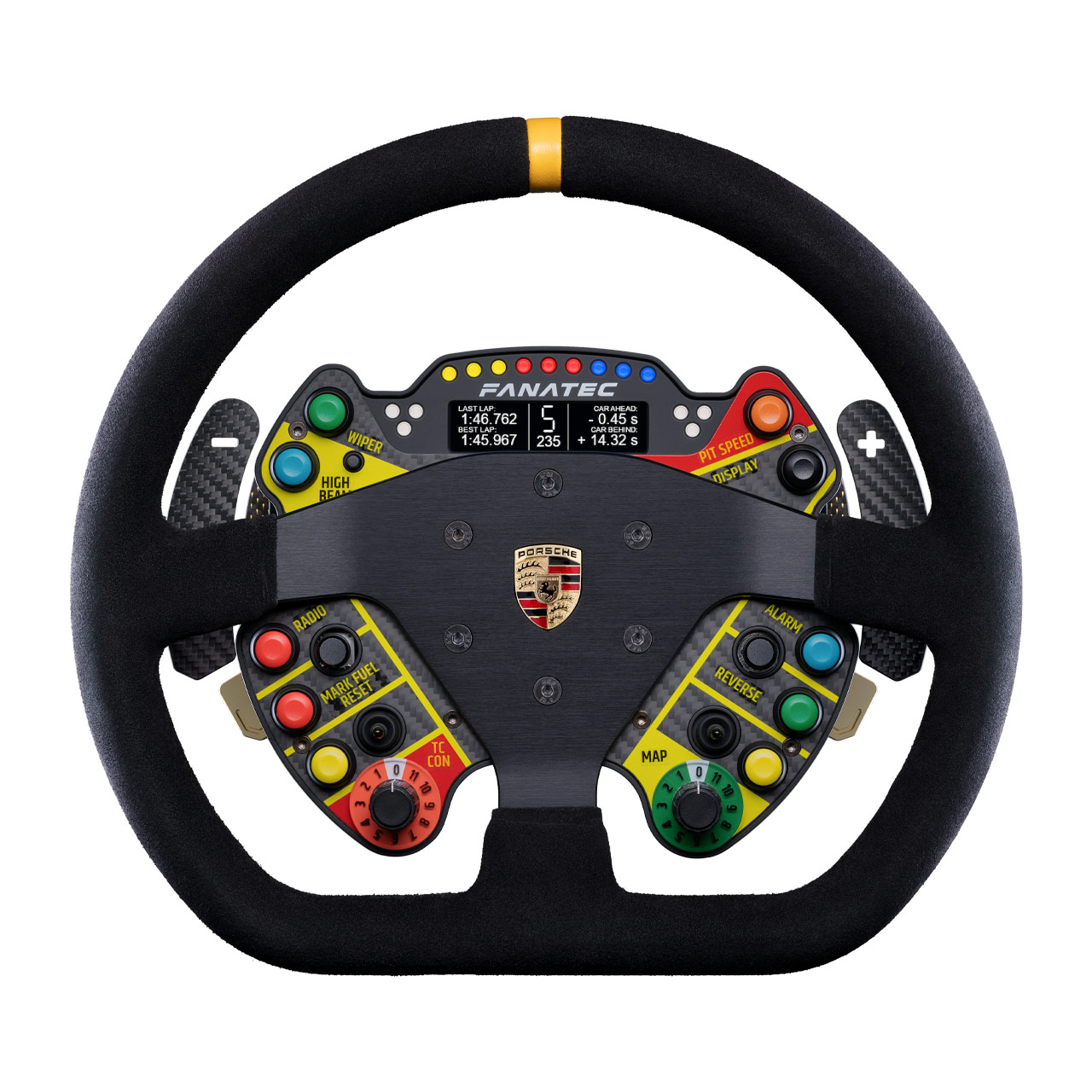 O volante Fanatec Podium Porsche 911 GT3 R é uma réplica em tamanho real(32 cm de diâmetro) do verdadeiro volante do Porsche 991 GT3 R em alumínio escovado e anodizado, e está disponível em duas versões: um modelo revestido em pele de camurça pura e o outro em pele lisa topo de gama.
